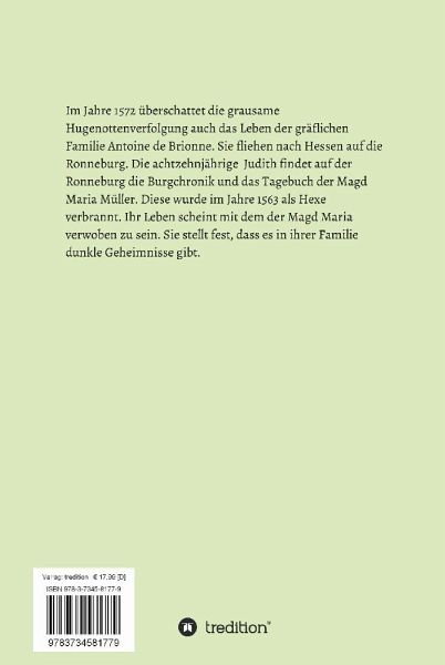 Im Jahre 1572 überschattet die grausame Hugenottenverfolgung auch das Leben der Grafen- Familie Antoine de Brionne. Sie fliehen nach Hessen auf die Ronneburg.Die achtzehnjährige Tochter Judith findet auf der Ronneburg die Burgchronik und das Tagebuch der Magd Maria Müller. Diese wurde im Jahre 1563 als Hexe verbrannt. Ihr Leben scheint mit dem der Magd Maria verwoben zu sein.Sie stellt fest, dass es in ihrer eigenen Familie dunkle Geheimnisse gibt.