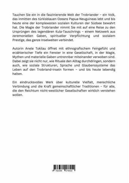Tauchen Sie ein in die faszinierende Welt der Trobriander - ein Volk, das inmitten des türkisblauen Ozeans Papua-Neuguineas lebt und bis heute eine der komplexesten sozialen Kulturen der Südsee bewahrt hat. Die Magie der Trobriander nimmt Sie mit auf eine Reise zu den Ursprüngen des legendären Kula-Tauschrings - einem Netzwerk aus zeremoniellen Gaben, spiritueller Verpflichtung und sozialem Prestige, das ganze Inselwelten verbindet.Autorin Anele Tokilau öffnet mit ethnografischem Feingefühl und erzählerischer Tiefe ein Fenster in eine Gesellschaft, in der Magie, Mythen und materielle Gaben untrennbar mit-einander verwoben sind. Dabei zeigt sie nicht nur, wie Rituale den Alltag durchdringen, sondern auch, wie soziale Strukturen, Sprache und Glaubenssysteme das Leben auf den Trobriand-Inseln formen - und bis heute lebendig halten.