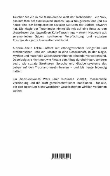 Tauchen Sie ein in die faszinierende Welt der Trobriander - ein Volk, das inmitten des türkisblauen Ozeans Papua-Neuguineas lebt und bis heute eine der komplexesten sozialen Kulturen der Südsee bewahrt hat. Die Magie der Trobriander nimmt Sie mit auf eine Reise zu den Ursprüngen des legendären Kula-Tauschrings - einem Netzwerk aus zeremoniellen Gaben, spiritueller Verpflichtung und sozialem Prestige, das ganze Inselwelten verbindet.Autorin Anele Tokilau öffnet mit ethnografischem Feingefühl und erzählerischer Tiefe ein Fenster in eine Gesellschaft, in der Magie, Mythen und materielle Gaben untrennbar mit-einander verwoben sind. Dabei zeigt sie nicht nur, wie Rituale den Alltag durchdringen, sondern auch, wie soziale Strukturen, Sprache und Glaubenssysteme das Leben auf den Trobriand-Inseln formen - und bis heute lebendig halten.