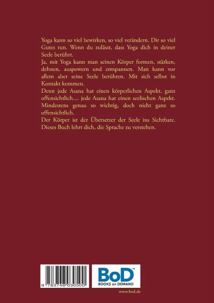 Yoga kann so viel bewirken, so viel verändern. Dir so viel Gutes tun. Wenn du zulässt, dass Yoga dich in deiner Seele berührt. Ja, mit Yoga kann man seinen Körper formen, stärken, dehnen, auspowern und entspannen. Man kann vor allem aber seine Seele berühren. Mit sich selbst in Kontakt kommen.Denn jede Asana hat einen körperlichen Aspekt, ganz offensichtlich ... jede Asana hat einen seelischen Aspekt. Mindestens genauso wichtig, doch nicht ganz so offensichtlich.Der Körper ist der Übersetzer der Seele ins Sichtbare. Dieses Buch lehrt dich, die Sprache zu verstehen.