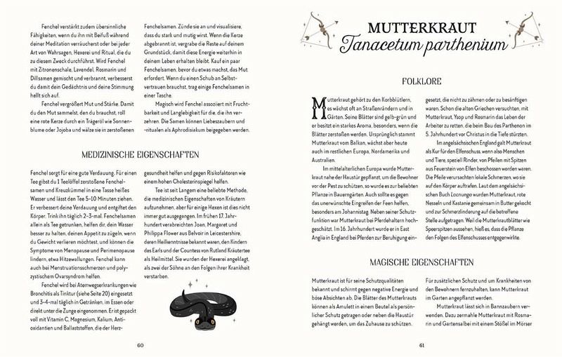 Erfahre, wie du Hunderte von medizinischen Tees, Tinkturen, Sirupen, Ölen, Packungen und Salben selbst zubereitest. Lerne Rituale und Zaubersprüche kennen, mit denen du die magischen Eigenschaften von mehr als 40 Pflanzengewinnen kannst. Die faszinierende Geschichte und die überlieferte Folklore einiger der beliebtesten Kräuter und Blumen im Hexenhandwerk werden dir von der griechischen Mythologie bis zur chinesischen Kräutermedizin präsentiert.Ob du neu bist in Hexenhandwerk und Folklore oder schon erfahren - mit dem Wissen aus Magie und Folklore der Pflanzen und Kräuter kannst du deine eigene und einzigartige grüne Magie entwickeln.
