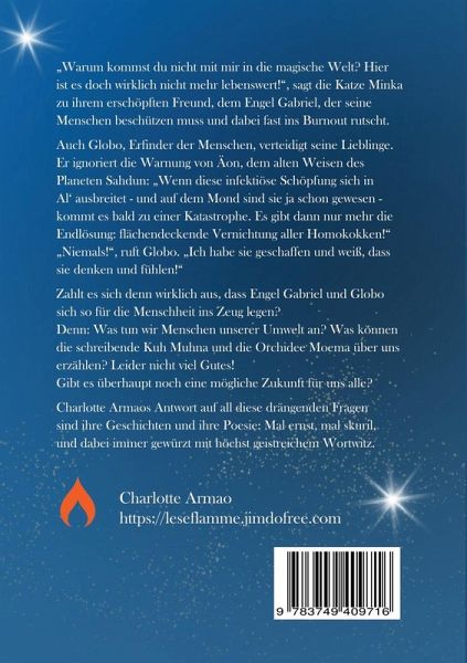 "Warum kommst du nicht mit in die magische Welt? Hier ist es doch wirklich nicht mehr lebenswert!", sagt die Katze Minka zu ihrem erschöpften Freund, dem Engel Gabriel, der seine Menschen beschützen muss.Auch Globo verteidigt die Menschheit, als Äon, der alte Weise, des Planeten Sahdun ihn warnt: "Wenn Ihre infektiöse Schöpfung sich ins Al' ausbreitet - und auf dem Mond sind sie ja schon gewesen - kommt es bald zu einer Katastrophe. Es gibt nur mehr die Endlösung: flächendeckende Vernichtung aller Homokokken!""Niemals!", ruft Globo. "Ich habe sie geschaffen und weiß, dass sie denken und fühlen!"Was tun die Menschen den Tieren an? Wie gehen sie mit der Umwelt um? Wie könnte eine mögliche Zukunft aussehen? Zahlt es sich aus, dass Engel Gabriel und Globo sich so für die Menschheit ins Zeug legen? Zu diesen und andere Fragen schreibt Charlotte Armao Geschichten und Poesie als Antwort und, die mit geistreichem Humor und Wortspielereien gewürzt sind.