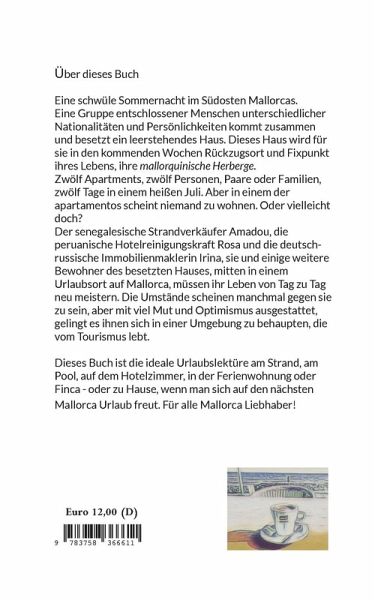 Eine schwüle Sommernacht im Südosten Mallorcas. Eine Gruppe entschlossener Menschen unterschiedlicher Nationalitäten und Persönlichkeiten kommt zusammen und besetzt ein leerstehendes Haus. Dieses Haus wird für sie in den kommenden Wochen Rückzugsort und Fixpunkt ihres Lebens, ihre mallorquinische Herberge. Zwölf Apartments, zwölf Personen, Paare oder Familien, zwölf Tage in einem heißen Juli. Aber in einem der apartamentos scheint niemand zu wohnen. Oder vielleicht doch?Der senegalesische Strandverkäufer Amadou, die peruanische Hotelreinigungskraft Rosa und die deutsch-russische Immobilienmaklerin Irina, sie und einige weitere Bewohner des besetzten Hauses, mitten in einem Urlaubsort auf Mallorca, müssen ihr Leben von Tag zu Tag neu meistern. Die Umstände scheinen manchmal gegen sie zu sein, aber mit viel Mut und Optimismus ausgestattet, gelingt es ihnen sich in einer Umgebung zu behaupten, die vom Tourismus lebt.