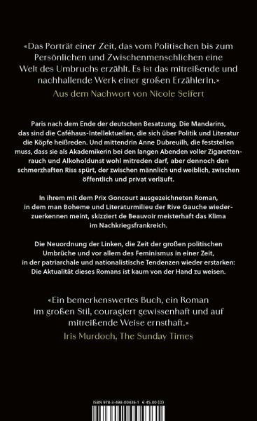 Paris nach dem Ende der deutschen Besatzung. Die Mandarins, das sind die Caféhaus-Intellektuellen, die sich über Politik und Literatur die Köpfe heißreden. Und mittendrin Anne Dubreuilh, die feststellen muss, dass sie als Akademikerin bei den langen Abenden voller Zigarettenrauch und Alkoholdunst wohl mitreden darf, aber dennoch den schmerzhaften Riss spürt, der zwischen männlich und weiblich, zwischen öffentlich und privat verläuft.