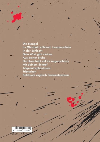 Die Mangel / Im Gleisbett wühlend, Lampenschein / In der Schlacht / Dein Wort gibt meines / Aus deiner Stube / Der Kuss hebt auf im Augenschluss / Mit deinem Schopf / Allquantorphantasien / Triptychon / Soldbuch zugleich Personalausweis