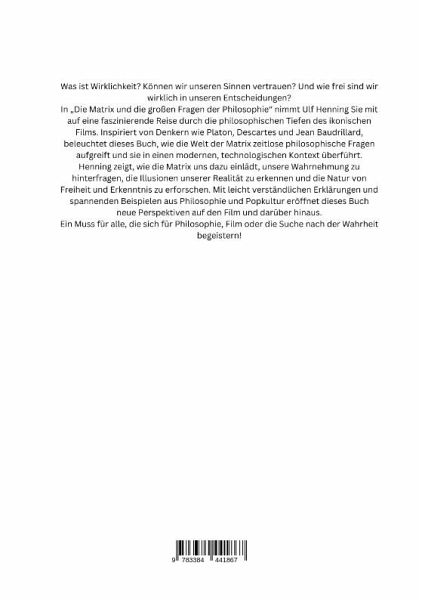 Was ist Wirklichkeit? Können wir unseren Sinnen vertrauen? Und wie frei sind wir wirklich in unseren Entscheidungen?In "Die Matrix und die großen Fragen der Philosophie" nimmt Ulf Henning Sie mit auf eine faszinierende Reise durch die philosophischen Tiefen des ikonischen Films. Inspiriert von Denkern wie Platon, Descartes und Jean Baudrillard, beleuchtet dieses Buch, wie die Welt der Matrix zeitlose philosophische Fragen aufgreift und sie in einen modernen, technologischen Kontext überführt.Henning zeigt, wie die Matrix uns dazu einlädt, unsere Wahrnehmung zu hinterfragen, die Illusionen unserer Realität zu erkennen und die Natur von Freiheit und Erkenntnis zu erforschen. Mit leicht verständlichen Erklärungen und spannenden Beispielen aus Philosophie und Popkultur eröffnet dieses Buch neue Perspektiven auf den Film und darüber hinaus.Ein Muss für alle, die sich für Philosophie, Film oder die Suche nach der Wahrheit begeistern!