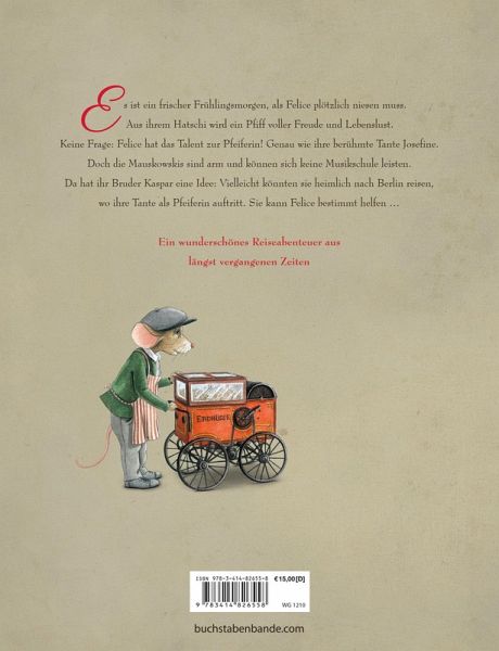 Ein wunderschönes Reiseabenteuer aus längst vergangenen Zeiten Es ist ein frischer Frühlingsmorgen, als Felice plötzlich niesen muss. Aus ihrem Hatschi wird ein Pfiff voller Freude und Lebenslust. Keine Frage: Felice hat das Talent zur Pfeiferin! Genau wie ihre berühmte Tante Josefine. Doch die Mauskowskis sind arm und können sich keine Musikschule leisten. Da hat ihr Bruder Kaspar eine Idee: Vielleicht könnten sie heimlich nach Berlin reisen, wo ihre Tante als Pfeiferin auftritt. Sie kann Felice bestimmt helfen - Band 2 des historischen Mäusebilderbuchs von Bestseller-Autor Michael Engler ("Wir zwei gehören zusammen")- Zwei kleine Mäusekinder reisen ins Berlin der 20er Jahre und zeigen, wie man mit Mut und Talent über sich hinauswachsen kann- Die liebevollen und detailreichen Bilder von Martina Matos eigenen sich wunderbar, um mit Kindern darüber zu sprechen, wie die Menschen früher lebten: Welche Verkehrsmittel gab es? Wie waren die Menschen gekleidet? Welche Berufe übten sie aus?