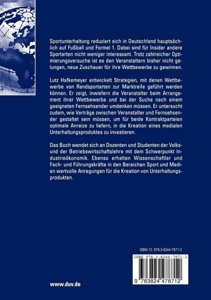 Lutz Hafkemeyer entwickelt Strategien, mit denen Wettbewerbe von Randsportarten zur Marktreife geführt werden können. Er zeigt, inwiefern die Veranstalter beim Arrangement ihrer Wettbewerbe und bei der Suche nach einem geeigneten Fernsehsender umdenken müssen. Er untersucht zudem, wie Verträge zwischen Veranstalter und Fernsehsender gestaltet sein müssen, um für beide Kontraktparteien optimale Anreize zu liefern, in die Kreation eines medialen Unterhaltungsproduktes zu investieren.