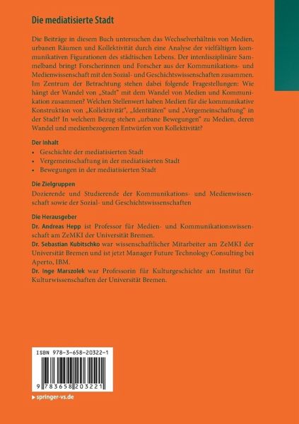 Die Beiträge in diesem Buch untersuchen das Wechselverhältnis von Medien, urbanen Räumen und Kollektivität durch eine Analyse der vielfältigen kommunikativen Figurationen des städtischen Lebens. Der interdisziplinäre Sammelband bringt Forscherinnen und Forscher aus der Kommunikations- und Medienwissenschaft mit den Sozial- und Geschichtswissenschaften zusammen. Im Zentrum der Betrachtung stehen dabei folgende Fragestellungen: Wie hängt der Wandel von "Stadt" mit dem Wandel von Medien und Kommunikation zusammen? Welchen Stellenwert haben Medien für die kommunikative Konstruktion von "Kollektivität", "Identitäten" und "Vergemeinschaftung" in der Stadt? In welchem Bezug stehen "urbane Bewegungen" zu Medien, deren Wandel und medienbezogenen Entwürfen von Kollektivität?