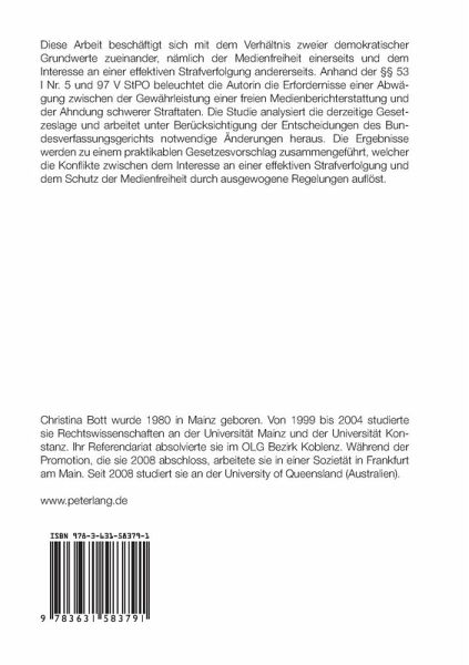 53 I Nr. 5 und 97 V StPO beleuchtet die Autorin die Erfordernisse einer Abwägung zwischen der Gewährleistung einer freien Medienberichterstattung und der Ahndung schwerer Straftaten. Die Studie analysiert die derzeitige Gesetzeslage und arbeitet unter Berücksichtigung der Entscheidungen des Bundesverfassungsgerichts notwendige Änderungen heraus. Die Ergebnisse werden zu einem praktikablen Gesetzesvorschlag zusammengeführt, welcher die Konflikte zwischen dem Interesse an einer effektiven Strafverfolgung und dem Schutz der Medienfreiheit durch ausgewogene Regelungen auflöst.