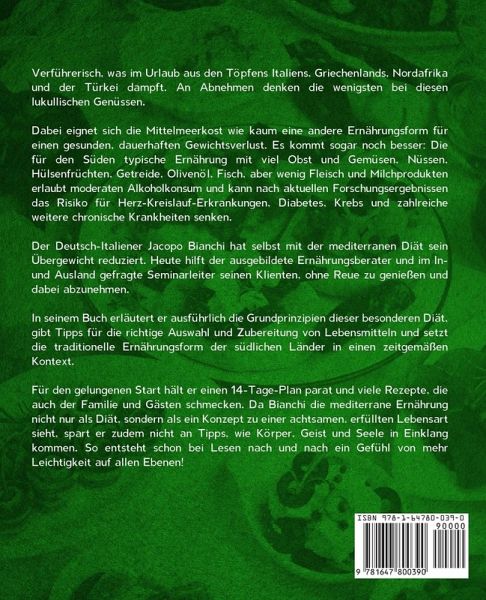 Mit der mediterranen Diät voller Lebensfreude und Genuss zum Wunschgewicht Übergewicht ist nicht nur ein ästhetisches Problem, das Betroffene bis in die Depression führen kann. Sondern eine riesige Herausforderung für die Volksgesundheit, was Wissenschaftler Alarm schlagen lässt: Rund fünf Millionen Deutsche nehmen täglich Statine ein - mit alarmierenden Folgen: Auf lange Sicht erhöht die Einnahme das Risiko, einen Herzinfarkt oder Schlaganfall zu erleiden. (US-Magazin Lancet) Diabetes haben etwa sechs Millionen Deutsche - täglich werden 1000 neue Krankheitsfälle diagnostiziert - Besonders erschreckend: Immer mehr Kinder und Jugendliche erkranken an Diabetes. Wer viel Fett im Bauchraum hat und einen Body Mass Index von über 30 aufweist, hat ein signifikant höheres Risiko, Bluthochdruck zu entwickeln. Kürzlich konnte bewiesen werden, dass bereits ein paar Kilo zu viel das Leben um ein Jahr verkürzen. Kaum zu glauben: Statistisch gesehen sterben stark Übergewichtige zehn Jahre früher. (Cambridge Universität) Fazit: Wer seinen Kilos nicht den Kampf ansagt, hat nicht nur weniger Lebensqualität, sondern auch eine deutlich geringere Lebenserwartung! Autor Jacopo Bianchi ist ein gefragter Ernährungsberater und wird im In- und Ausland zu Seminaren über gesunde mediterrane Kost eingeladen. Die Frage, wie das Abnehmen mit der mediterranen Diät funktioniert, hat er nun in seinem Buch umfassend beantwortet: Sie wollen gesund abnehmen, aber sich nicht mit ständigem Verzicht quälen? Lernen Sie in diesem Buch, wie Sie bei der mediterranen Diät Genuss mit Leichtigkeit paaren können. Erfahren Sie, warum die mediterrane Diät die beste Ernährungsform bei Herz-Kreislauf-Problemen ist, die Knochengesundheit stärkt und vermutlich sogar bei der Prävention von Krebs helfen könnte. Die richtige Auswahl von Zutaten kann Wunder wirken. Lesen Sie einfach die Kapitel über Lebensmittelauswahl, den Schlüsselaspekt Frische und lernen Sie drei ebenso simple wie geniale Zubereitungsregeln kennen, die ihren Stoffwechsel ankurbeln! Sie lieben internationale Gerichte und fragen sich, wie Sie die Highlights aus dem Urlaub in Ihren Diätplan integrieren? Schauen Sie in dem Buch in die Kochtöpfe Frankreichs, Italiens, Griechenland, der Türkei und im nordafrikanischen Raum. Wichtig ist, eine Diät nicht einfach als ein Abspeckprogramm, sondern als ein Konzept für eine ganzheitliche Lebensweise zu sehen. Befolgen Sie fünf einfache Tipps aus dem Buch und Sie werden nicht nur bequem abnehmen, sondern in vielen Bereichen eine positive Wendung erziehen Wussten Sie eigentlich, warum so viele Diäten trotz bester Vorsätze zum Scheitern verurteilt sind? Erfahren Sie etwas über realistische Ziele, die Kunst der Geduld und den richtigen Umgang mit Kalorien, um ihr Vorhaben mit einer Kombination aus Willenskraft und Leichtigkeit anzugehen. Die ersten Tage einer Ernährungsumstellung sind immer die schwersten. Im Buch finden Sie einen Plan für 14 Tage, der die Pfunde schmelzen lässt und Sie kräftig motiviert. Jetzt liegt es an Ihnen, sich weiter mit eintönigen Diäten und Wunderpulvern zu quälen oder den Start in ein neues, schlankes Leben voller Freude und Balance für Körper, Geist und Seele zu wagen. Stelle Sie die Weichen um auf Dolce vita und sichern Sie sich jetzt Ihr Exemplar!