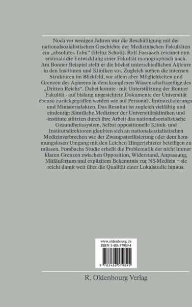 "Forsbach argumentiert stets sicher und überzeugend, wägt auf der Basis eines immensen Quellenstudiums sorgfältig ab und kommt in allen Fällen zu einem ausgewogenen und für den Leser nachvollziehbaren Urteil. [...] Forsbach ist [...] ein für die lokale Universitätsforschung wesentliches Standardwerk gelungen, das auch Anregunge dahingehend bieten sollte, wie die Geschichte anderer Universitäten, Fakultäten und Fachbereiche aufgearbeitet werden kann." Wolfgang Woelk in: Neue Politische Literatur, 51/2006 "Das zu besprechende Buch verdient aus einer ganzen Reihe von Gründen große Anerkennung." Klaus Oldenhage in: Rheinische Vierteljahrsblätter "Rolf Forsbach weist nach, dass nicht alle Universitätsärzte in Führungspositionen 'gleichgeschaltet' und nicht alle Mitglieder der NSDAP waren. [...] Anlass für Forsbachs gründliche und quellengesättigte Studie war das Schiksal einer jüdischen Ärztin, die 1934 in Bonn ihre Doktorprüfung zwar abgelegt hatte, der man jedoch zunächst ihre Promotionsurkunde und damit das Recht zum Führen des Titels vorenthalten wollte." Hermann Mellinghoff in: FAZ, 27.12.2007 "Die von Forsbach vorgelegte Monographie [...] ist hinsichtlich ihrer Entstehungsgeschichte, ihrer detaillierten Komplexität, Quellenvielfalt und einer vorsichtig zurückhaltenden Beurteilung der agierenden Persönlichkeiten ein verdienstvolles Unikat in der medizinhistorischen, sozial- und disziplingeschichtlichen Forschung. Sie ist als Maßstab weiterer Forschungen anzusehen." Susanne Zimmermann, sehepunkte "Durch die Breite seiner Untersuchung, die sich nicht eng an die Fakultät bindet, und die detailgetreue Darstellung mit vielen sorgfältig recherchierten Tabellen ist das Werk von Forsbach nicht nur für die Universitäts- und Medizingeschichte eine Bereicherung." Thomas Deres, Geschichte in Köln, 57/2010
