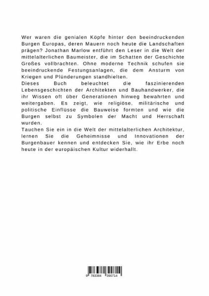 Wer waren die genialen Köpfe hinter den beeindruckenden Burgen Europas, deren Mauern noch heute die Landschaften prägen? Jonathan Marlow entführt den Leser in die Welt der mittelalterlichen Baumeister, die im Schatten der Geschichte Großes vollbrachten. Ohne moderne Technik schufen sie beeindruckende Festungsanlagen, die dem Ansturm von Kriegen und Plünderungen standhielten.Dieses Buch beleuchtet die faszinierenden Lebensgeschichten der Architekten und Bauhandwerker, die ihr Wissen oft über Generationen hinweg bewahrten und weitergaben. Es zeigt, wie religiöse, militärische und politische Einflüsse die Bauweise formten und wie die Burgen selbst zu Symbolen der Macht und Herrschaft wurden.Tauchen Sie ein in die Welt der mittelalterlichen Architektur, lernen Sie die Geheimnisse und Innovationen der Burgenbauer kennen und entdecken Sie, wie ihr Erbe noch heute in der europäischen Kultur widerhallt.