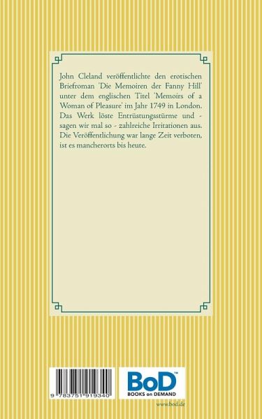 John Cleland veröffentlichte die Memoiren der Fanny Hilll unter dem englischen Titel Memoirs of a Woman of Pleasure als einen erotischen Briefroman in London im Jahr 1749. Das Werk löste - sagen wir mal so - Entrüstungsstürme und zahlreiche Irritationen aus. Die Veröffentlichung war lange Zeit verboten, ist es mancherorts bis heute.