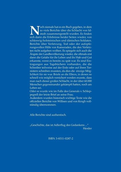 Eine Sammlung zeitgenössischer Berichte über die Schlacht bei Idstedt vom 24. und 25. Juli 1850. In dem Buch lesen Sie über die persönlichen Erlebnisse von über 30 dänischen und schleswig-holsteinischen Soldaten im Schleswig-Holsteinischen Erhebungskrieg gegen Dänemark (Treaarskrigen) 1848-1850 während der Schlacht bei Idstedt. Berichte über das Lagerleben und die Verpflegung der Soldaten. Der Kampf aus unmittelbarer Nähe. Verletzung und Tod eines Freundes oder Bruders. Die aufopferungsvolle Hilfe von Kameraden, die den Verwundeten nicht aufgeben wollten und gegen anstürmende Gegner verteidigten. Die Ängste der Landbevölkerung. Tagebucheintragungen. Briefe an die Eltern. Berichte von: General v. d. Horst - Brief v. Schleppegrell - v. Willisen (Armeebericht, komplett), - v. Krogh (Kriegs-Rapport, komplett), ein Bericht aus der Times vom 30. Juli 1850 von William Howard Russell.