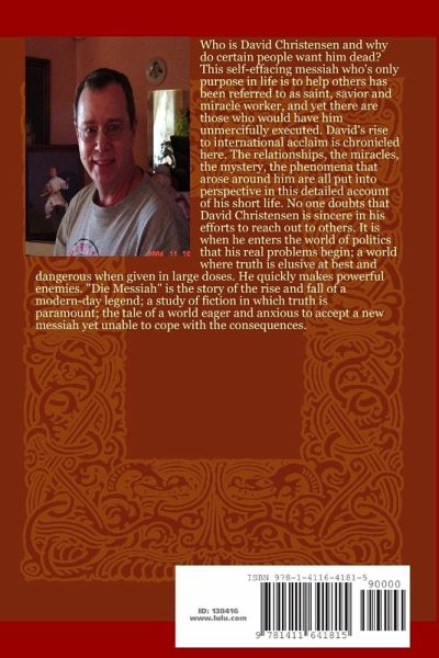 Who is David Christensen and why do certain people want him dead? This self-effacing messiah who's only purpose in life is to help others has been referred to as saint, savior and miracle worker, and yet there are those who would have him unmercifully executed. David's rise to international acclaim is chronicled here. The relationships, the miracles, the mystery, the phenomena that arose around him are all put into perspective in this detailed account of his short life. No one doubts that David Christensen is sincere in his efforts to reach out to others. It is when he enters the world of politics that his real problems begin; a world where truth is elusive at best and dangerous when given in large doses. He quickly makes powerful enemies. "Die Messiah" is the story of the rise and fall of a modern-day legend; a study of fiction in which truth is paramount; the tale of a world eager and anxious to accept a new messiah yet unable to cope with the consequences.