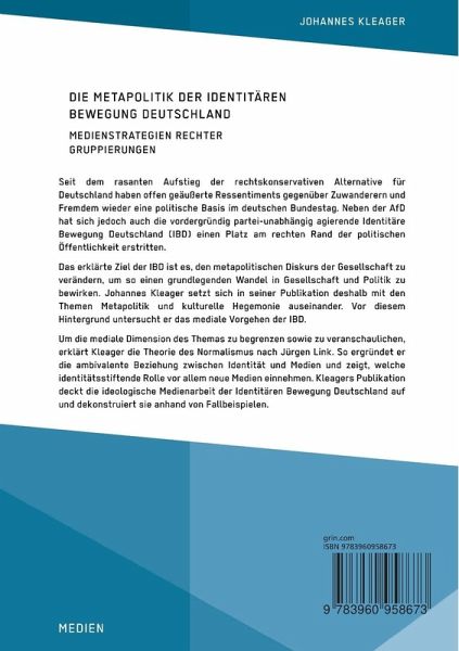 Seit dem rasanten Aufstieg der rechtskonservativen Alternative für Deutschland haben offen geäußerte Ressentiments gegenüber Zuwanderern und Fremdem wieder eine politische Basis im deutschen Bundestag. Neben der AfD hat sich jedoch auch die vordergründig partei-unabhängig agierende Identitäre Bewegung Deutschland (IBD) einen Platz am rechten Rand der politischen Öffentlichkeit erstritten.Das erklärte Ziel der IBD ist es, den metapolitischen Diskurs der Gesellschaft zu verändern, um so einen grundlegenden Wandel in Gesellschaft und Politik zu bewirken. Johannes Kleager setzt sich in seiner Publikation deshalb mit den Themen Metapolitik und kulturelle Hegemonie auseinander. Vor diesem Hintergrund untersucht er das mediale Vorgehen der IBD.Um die mediale Dimension des Themas zu begrenzen sowie zu veranschaulichen, erklärt Kleager die Theorie des Normalismus nach Jürgen Link. So ergründet er die ambivalente Beziehung zwischen Identität und Medien und zeigt, welche identitätsstiftendeRolle vor allem neue Medien einnehmen. Kleagers Publikation deckt die ideologische Medienarbeit der Identitären Bewegung Deutschland auf und dekonstruiert sie anhand von Fallbeispielen.Aus dem Inhalt:-Rechtspopulismus;-Ideologie;-Normativität;-Social Media;-Diskurstheorie