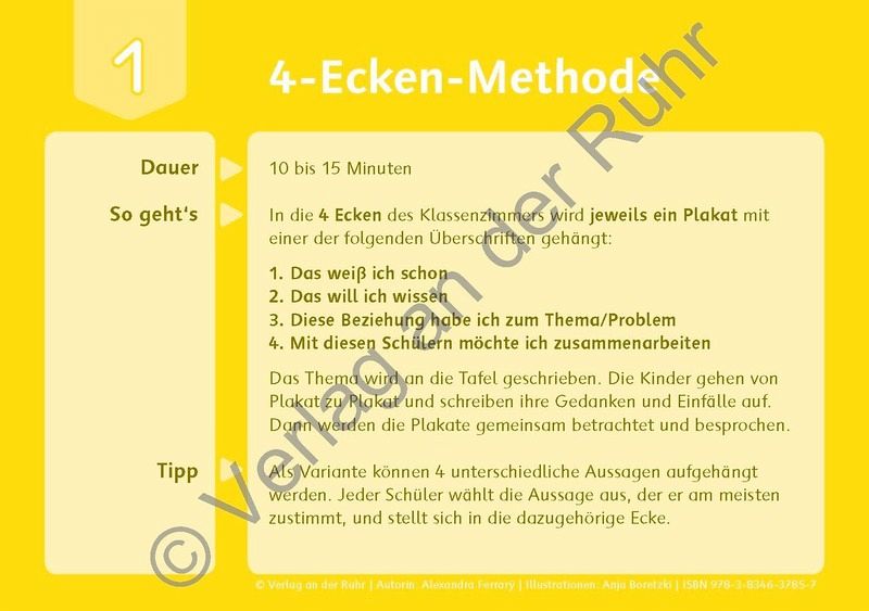 Methoden-Bildkarten für Lehrer an Grundschule und Förderschule, fächerübergreifend, Klasse 1-4 +++ Ob Fishbowl, Bienenkorb, Partner-Puzzle oder Museumsrundgang: Mit dieser Kartei haben Sie die 30 beliebtesten Unterrichtsmethoden für kooperatives Lernen jederzeit griffbereit - und können immer genau die passende aus dem (Methoden-)Hut zaubern. Die handlichen A5-Karten sind zunächst einmal für Sie gedacht; als fächerübergreifender Ideen- und Anleitungsfundus, aus dem Sie ganz schnell auswählen können. Neben kurzen, klaren Anleitungen finden Sie Angaben zu Einsatzmöglichkeiten, Material, Zeitaufwand, Sozialform (Einzelarbeit, Partnerarbeit, Gruppenarbeit inklusive Schülerzahl) sowie hilfreiche Tipps. Die Texte sind bewusst einfach und kindgerecht geschrieben - so müssen Sie beim Erklären nichts mehr umformulieren oder können die Schüler gleich selbst nachlesen lassen, wie die Methode funktioniert. Die Karten-Vorderseiten illustrieren die Methoden zudem mit je einem farbigen, kindgerechten Bild. Die praktischen Organisationshilfen können Sie daher auch gut zur visuellen Orientierung an die Tafel hängen. Alle Methoden sind verschiedenen Kompetenzbereichen bzw. Einsatzmöglichkeiten zugeordnet. So hat das Lernen buchstäblich Methode - und zwar immer genau die richtige, mit der Sie für Abwechslung, Motivation und Lernerfolge sorgen!
