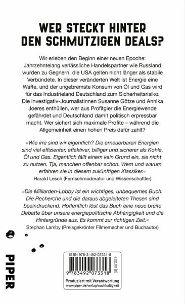 »Die Milliarden-Lobby ist ein wichtiges, unbequemes Buch. Die Recherche und die daraus abgeleiteten Thesen sind beeindruckend. Hoffentlich löst das Buch eine neue breite Debatte über unsere energiepolitische Abhängigkeit und die Hintergründe aus. Es kommt zur richtigen Zeit.« Stephan Lamby