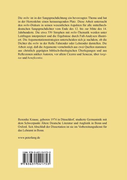 Die milte ist in der Sangspruchdichtung ein bevorzugtes Thema und hat in der Herrenlehre einen herausragenden Platz. Diese Arbeit untersucht den milte-Diskurs in seinen wesentlichen Aspekten für alle mittelhochdeutschen Sangspruchdichter vom Ende des 12. bis zur Mitte des 14. Jahrhunderts. Die etwa 550 Strophen mit milte-Thematik werden unter Leitfragen interpretiert und die Ergebnisse durch Fall-Analysen illustriert. Die Argumentationsstrategien unterscheiden sich je nachdem, ob die Dichter die milte in der Rolle Fahrender oder Lehrender darstellen. Die Arbeit zeigt, daß die Argumente vornehmlich aus zwei Quellen stammen: aus christlich geprägten biblisch-theologischen Überlegungen und aus Reflexionen antiker Autoren, vor allem Ciceros und Senecas, über largitas und beneficentia.