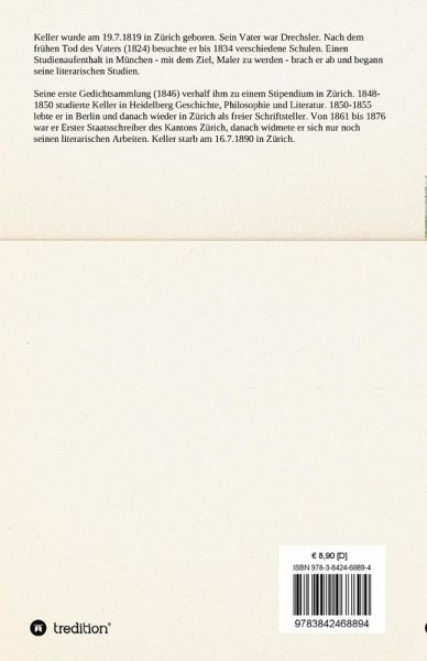 Keller wurde am 19.7.1819 in Zürich geboren. Sein Vater war Drechsler. Nach dem frühen Tod des Vaters (1824) besuchte er bis 1834 verschiedene Schulen. Einen Studienaufenthalt in München - mit dem Ziel, Maler zu werden - brach er ab und begann seine literarischen Studien.Seine erste Gedichtsammlung (1846) verhalf ihm zu einem Stipendium in Zürich. 1848-1850 studierte Keller in Heidelberg Geschichte, Philosophie und Literatur. 1850-1855 lebte er in Berlin und danach wieder in Zürich als freier Schriftsteller. Von 1861 bis 1876 war er Erster Staatsschreiber des Kantons Zürich, danach widmete er sich nur noch seinen literarischen Arbeiten. Keller starb am 16.7.1890 in Zürich.