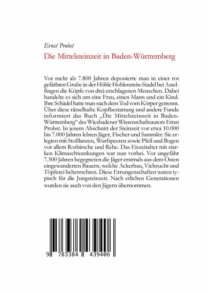 Vor mehr als 7.800 Jahren deponierte man in einer rotgefärbten Grube in der Höhle Hohlenstein-Stadel bei Asselfingen die Köpfe von drei erschlagenen Menschen. Dabei handelte es sich um eine Frau, einen Mann und ein Kind. Ihre Schädel hatte man nach dem Tod vom Körper getrennt. Über diese rätselhafte Kopfbestattung und andere Funde informiert das Taschenbuch "Die Mittelsteinzeit in Baden-Württemberg" des Wiesbadener Wissenschaftsautors Ernst Probst. In jenem Abschnitt der Steinzeit vor etwa 10.000 bis 7.000 Jahren lebten Jäger, Fischer und Sammler. Sie erlegten mit Stoßlanzen, Wurfspeeren sowie Pfeil und Bogen vor allem Rothirsche und Rehe. Das Eiszeitalter mit starken Klimaschwankungen war nun vorbei. Vor ungefähr 7.500 Jahren begegneten die Jäger erstmals aus dem Osten eingewanderten Bauern, welche Ackerbau, Viehzucht und Töpferei beherrschten. Diese Errungenschaften waren typisch für die Jungsteinzeit. Nach etlichen Generationen wurden sie auch von den Jägern übernommen.