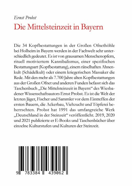 Die 34 Kopfbestattungen in der Großen Ofnethöhle bei Holheim in Bayern werden in der Fachwelt sehr unterschiedlich gedeutet. Es ist von grausamen Menschenopfern, rituell motiviertem Kannibalismus, einer spezifischen Bestattungsart (Kopfbestattung), einem rätselhaften Ahnenkult (Schädelkult) oder einem kriegerischen Massaker die Rede. Mit den mehr als 7.700 Jahre alten Kopfbestattungen aus der Großen Ofnet und anderen Funden befasst sich das Taschenbuch "Die Mittelsteinzeit in Bayern" des Wiesbadener Wissenschaftsautors Ernst Probst. Es ist die Welt der letzten Jäger, Fischer und Sammler vor dem Eintreffen der ersten Bauern, die Ackerbau, Viehzucht und Töpferei beherrschten. Probst hat 1991 das umfangreiche Werk "Deutschland in der Steinzeit" veröffentlicht. 2019 publizierte er E-Books und Taschenbücher über einzelne Kulturstufen und Kulturen der Steinzeit.