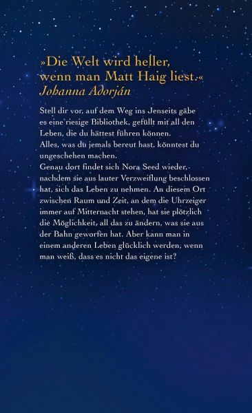 Stell dir vor, auf dem Weg ins Jenseits gäbe es eine riesige Bibliothek, gefüllt mit all den Leben, die du hättest führen können. Alles, was du jemals bereut hast, könntest du ungeschehen machen. Genau dort findet sich Nora Seed wieder, nachdem sie aus lauter Verzweiflung beschlossen hat, sich das Leben zu nehmen. An diesem Ort zwischen Raum und Zeit, an dem die Uhrzeiger immer auf Mitternacht stehen, hat sie plötzlich die Möglichkeit, all das zu ändern, was sie aus der Bahn geworfen hat. Aber kann man in einem anderen Leben glücklich werden, wenn man weiß, dass es nicht das eigene ist?