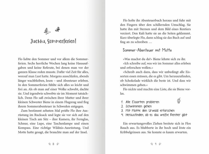 Flo ist Feuer und Flamme: In den Sommerferien darf sie ihre Brieffreundin Motte besuchen. Die lebt auf einer Insel in Schweden und hat eine superschlaue Ente namens Omelett. Vor Flo und Motte liegen drei herrliche Wochen Meer, Strand, Wald - und jede Menge Abenteuer! Die beiden haben mehr Ideen, als es Hagelzucker auf Zimtschnecken gibt. Sie möchten eine Bande gründen, den Wald und die Insel erkunden, nach wilden Tieren Ausschau halten und abends am Lagerfeuer gemütlich zusammensitzen. Und sie wollen - wie echte Forscherinnen - unbedingt herausfinden, ob es das sagenumwobene weiße Rentier wirklich gibt, von dem Opa Anders immer erzählt. Angeblich führt eine Spur verschlüsselter Hinweise zu dem seltenen Tier. Doch Mottes Bruder Jonte will mit seiner Bande das Rätsel ebenfalls lösen. Ganz klar, dass Flo und Motte ihnen zuvorkommen müssen. Und schon sind sie mittendrin im schönsten Sommerabenteuer aller Zeiten!