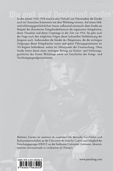 In den Jahren 1914-1918 machte eine Vielzahl von Printmedien die Kinder auch im Deutschen Kaiserreich mit dem Weltkrieg vertraut. Auf einem bild- und erfahrungsgeschichtlichen Ansatz aufbauend untersucht diese Studie am Beispiel der illustrierten Kriegskinderliteratur die sogenannte Kriegskultur, deren Visualität und deren Ursprünge in der Zeit vor 1914. Sie geht auch der Frage nach den möglichen Folgen dieser kulturellen Mobilisierung der Jüngsten nach. Insbesondere die Kinder des Bürgertums, die die wichtigste Zielgruppe dieser Kriegsbücher waren und später Führungspositionen im NS-Regime bekleideten, stehen im Mittelpunkt der Untersuchung. Diese Studie leistet damit einen wichtigen Beitrag zur Kultur- und Erfahrungsgeschichte des Ersten Weltkriegs sowie zur Geschichte der Kriegs- und Nachkriegsjugendgenerationen.
