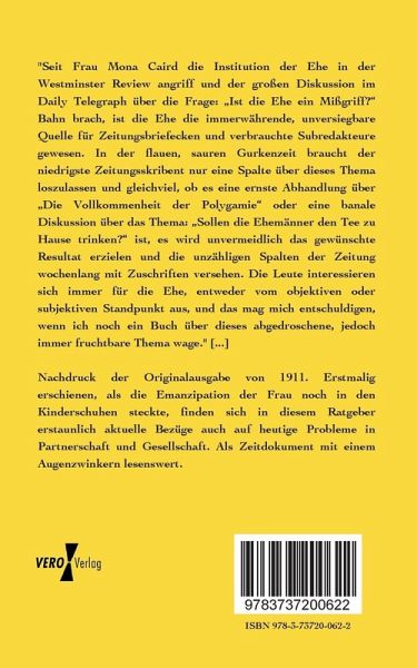 "Seit Frau Mona Caird die Institution der Ehe in der Westminster Review angriff und der großen Diskussion im Daily Telegraph über die Frage: Ist die Ehe ein Mißgriff? Bahn brach, ist die Ehe die immerwährende, unversiegbare Quelle für Zeitungsbriefecken und verbrauchte Subredakteure gewesen. In der flauen, sauren Gurkenzeit braucht der niedrigste Zeitungsskribent nur eine Spalte über dieses Thema loszulassen und gleichviel, ob es eine ernste Abhandlung über Die Vollkommenheit der Polygamie oder eine banale Diskussion über das Thema: Sollen die Ehemänner den Tee zu Hause trinken? ist, es wird unvermeidlich das gewünschte Resultat erzielen und die unzähligen Spalten der Zeitung wochenlang mit Zuschriften versehen. Die Leute interessieren sich immer für die Ehe, entweder vom objektiven oder subjektiven Standpunkt aus, und das mag mich entschuldigen, wenn ich noch ein Buch über dieses abgedroschene, jedoch immer fruchtbare Thema wage." [...]