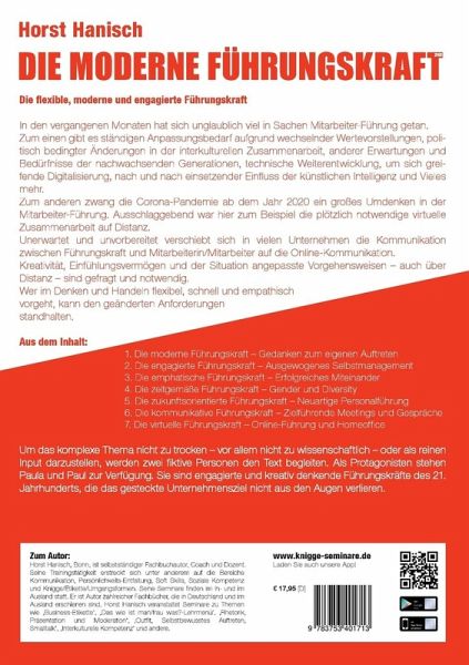 Die flexible, moderne und engagierte Führungskraft. In den vergangenen Monaten hat sich unglaublich viel in Sachen Mitarbeiter-Führung getan. Zum einen gibt es ständigen Anpassungsbedarf aufgrund wechselnder Wertevorstellungen, politisch bedingter Änderungen in der interkulturellen Zusammenarbeit, anderer Erwartungen und Bedürfnisse der nachwachsenden Generationen, technische Weiterentwicklung, um sich greifende Digitalisierung, nach und nach einsetzender Einfluss der künstlichen Intelligenz und Vieles mehr. Zum anderen zwang die Corona-Pandemie ab dem Jahr 2020 ein großes Umdenken in der Mitarbeiter-Führung. Ausschlaggebend war hier zum Beispiel die plötzlich notwendige virtuelle Zusammenarbeit auf Distanz. Unerwartet und unvorbereitet verschiebt sich in vielen Unternehmen die Kommunikation zwischen Führungskraft und Mitarbeiterin/Mitarbeiter auf die Online-Kommunikation. Kreativität, Einfühlungsvermögen und der Situation angepasste Vorgehensweisen - auch über Distanz - sind gefragt und notwendig. Wer im Denken und Handeln flexibel, schnell und empathisch vorgeht, kann den geänderten Anforderungen standhalten.Aus dem Inhalt:1. Die moderne Führungskraft - Gedanken zum eigenen Auftreten2. Die engagierte Führungskraft - Ausgewogenes Selbstmanagement3. Die emphatische Führungskraft - Erfolgreiches Miteinander4. Die zeitgemäße Führungskraft - Gender und Diversity5. Die zukunftsorientierte Führungskraft - Neuartige Personalführung6. Die kommunikative Führungskraft - Zielführende Meetings und Gespräche7. Die virtuelle Führungskraft - Online-Führung und HomeofficeUm das komplexe Thema nicht zu trocken - vor allem nicht zu wissenschaftlich - oder als reinen Input darzustellen, werden zwei fiktive Personen den Text begleiten. Als Protagonisten stehen Paula und Paul zur Verfügung. Sie sind engagierte und kreativ denkende Führungskräfte des 21. Jahrhunderts, die das gesteckte Unternehmensziel nicht aus den Augen verlieren.