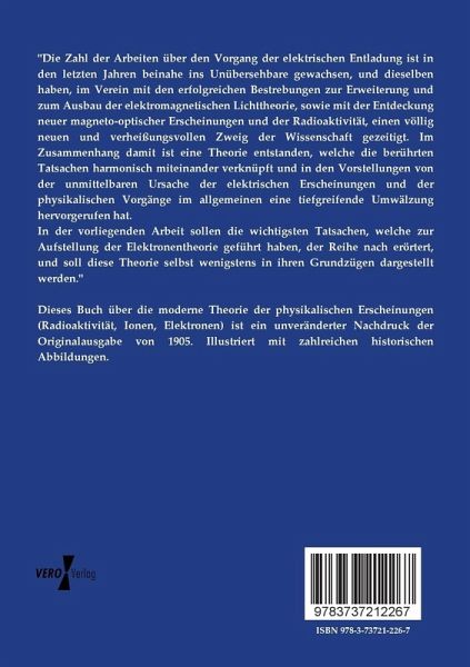 Dieses Buch über die moderne Theorie der physikalischen Erscheinungen (Radioaktivität, Ionen, Elektronen) ist ein unveränderter Nachdruck der Originalausgabe von 1905. Illustriert mit zahlreichen historischen Abbildungen.
