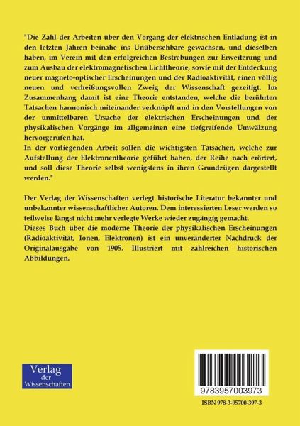 Dieses Buch über die moderne Theorie der physikalischen Erscheinungen (Radioaktivität, Ionen, Elektronen) ist ein unveränderter Nachdruck der Originalausgabe von 1905. Illustriert mit zahlreichen historischen Abbildungen.