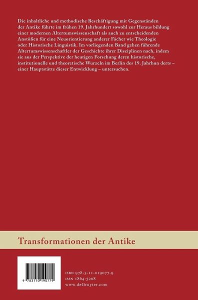 The occupation with objects from antiquity and the development of methods for this led both to the creation of a modern discipline of Classical Studies and to decisive impetuses for a re-orientation of other subjects such as theology and historical linguistics. In the present volume, leading scholars of antiquity visit the history of their disciplines from the perspective of present-day research by examining their historical, institutional and theoretical roots in 19th century Berlin â?? one of the main centres of this development.