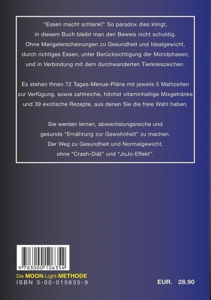 Bei der ¿MOON-LIGHT-METHODE¿ handelt es sich um eine neue Verbindung von gesunder Ernährung mit den Mondphasen, unter Berücksichtigung der durch den Mond durchwanderten Tierkreiszeichen. Schon lange werden bestimmte Nahrungsmittel mit Tierkreiszeichen in Verbindung gebracht. Der Autor hat die Mondphasen (zunehmend, abnehmend) berücksichtigt, da es ersichtlich ist, dass Inhaltsstoffe die dem Körper und der Verdauung nutzbringend sind bei zunehmendem Mond eingenommen werden sollten; und andererseits Nahrungsmittel, die dem Körper beim Abbau von schädlichen Stoffen helfen, bei abnehmendem Mond ihre beste Wirkung erzielen. Es stehen für jedes Tierkreiszeichen sechs komplette Tagesmenues mit jeweils 5 Mahlzeiten zur Verfügung. Außerdem 39 exotische Rezeptvorschläge zum Einbau in die Tagesmenue-Pläne und diverse Mixgetränke aus frischen Gemüse- und Obstsorten. Diese Art der Ernährung hilft dem Körper, die seit Jahren, täglich verabreichten Gifte abzubauen und verhilft außerdem zu einem erstrebenswerten Normalgewicht; ohne Verzicht auf schmackhafte und genussreiche Nahrung wird der Leser ¿Gesunde Ernährung zur Gewohnheit machen¿.