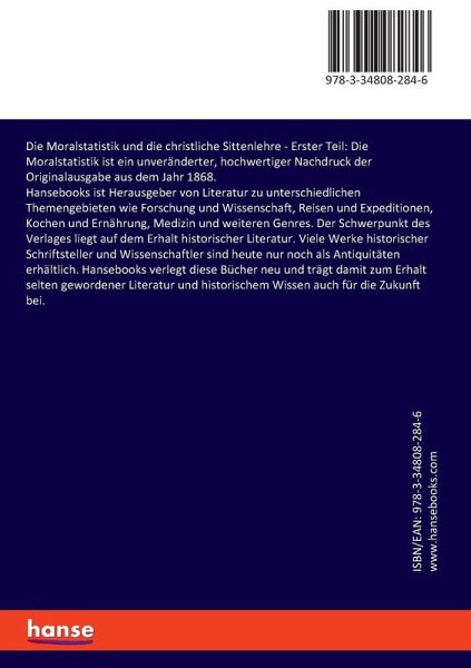 Die Moralstatistik und die christliche Sittenlehre - Erster Teil: Die Moralstatistik ist ein unveränderter, hochwertiger Nachdruck der Originalausgabe aus dem Jahr 1868.Hansebooks ist Herausgeber von Literatur zu unterschiedlichen Themengebieten wie Forschung und Wissenschaft, Reisen und Expeditionen, Kochen und Ernährung, Medizin und weiteren Genres. Der Schwerpunkt des Verlages liegt auf dem Erhalt historischer Literatur. Viele Werke historischer Schriftsteller und Wissenschaftler sind heute nur noch als Antiquitäten erhältlich. Hansebooks verlegt diese Bücher neu und trägt damit zum Erhalt selten gewordener Literatur und historischem Wissen auch für die Zukunft bei.