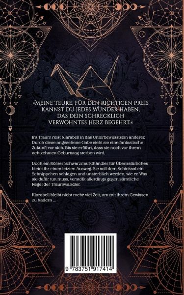 »Meine Teure, für den richtigen Preis kannst du jedes Wunder haben, das dein schrecklich verwöhntes Herz begehrt.« Im Traum reist Klarabell in das Unterbewusstsein anderer. Durch diese angesehene Gabe sieht sie eine fantastische Zukunft vor sich. Bis sie erfährt, dass sie noch vor ihrem achtzehnten Geburtstag sterben wird. Doch ein Kölner Schwarzmarkthändler für Übernatürliches bietet ihr einen letzten Ausweg. Sie soll dem Schicksal ein Schnippchen schlagen und unsterblich werden, wie er. Was sie dafür tun muss, verstößt allerdings gegen sämtliche Regeln der Traumwandler. Klarabell bleibt nicht mehr viel Zeit, um mit ihrem Gewissen zu hadern ...