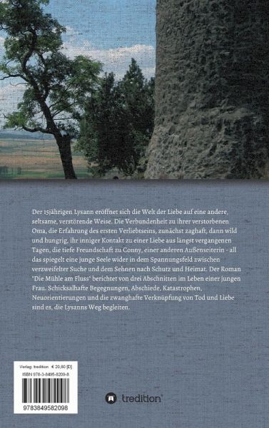 Der 15jährigen Lysann eröffnet sich die Welt der Liebe auf eine andere, seltsame, verstörende Weise. Die Verbundenheit zu ihrer verstorbenen Oma, die Erfahrung des ersten Verliebtseins, erst zaghaft, dann wild und hungrig, ihr inniger Kontakt zu einer Liebe aus längst vergangenen Tagen, die tiefe Freundschaft zu Conny, einer anderen Außenseiterin - all das spiegelt eine junge Seele wider in dem Spannungsfeld zwischen verzweifelter Suche und dem Sehnen nach Schutz und Heimat. Der Roman "Die Mühle am Fluss" berichtet von drei Abschnitten im Leben einer jungen Frau. Schicksalhafte Begegnungen, Abschiede, Katastrophen, Neuorientierungen und die zwanghafte Verknüpfung von Tod und Liebe sind es, die Lysanns Weg begleiten.
