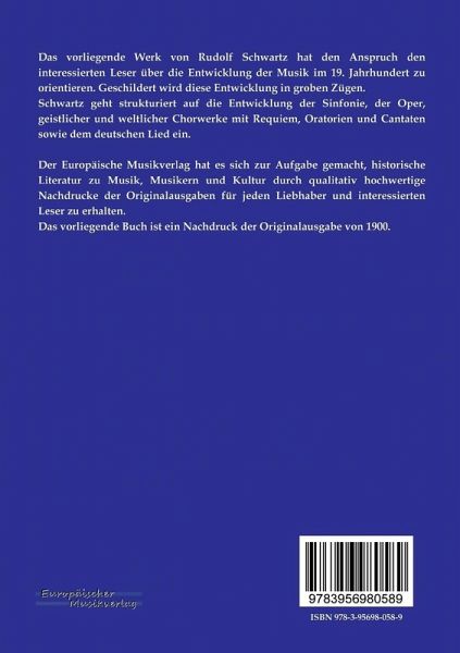 Das vorliegende Werk von Rudolf Schwartz hat den Anspruch den interessierten Leser über die Entwicklung der Musik im 19. Jahrhundert zu orientieren. Geschildert wird diese Entwicklung in groben Zügen.