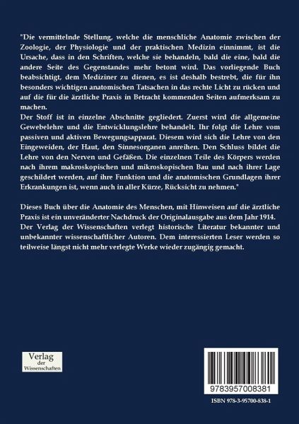 Dieses Buch über die Anatomie des Menschen, mit Hinweisen auf die ärztliche Praxis ist ein unveränderter Nachdruck der Originalausgabe aus dem Jahr 1914.