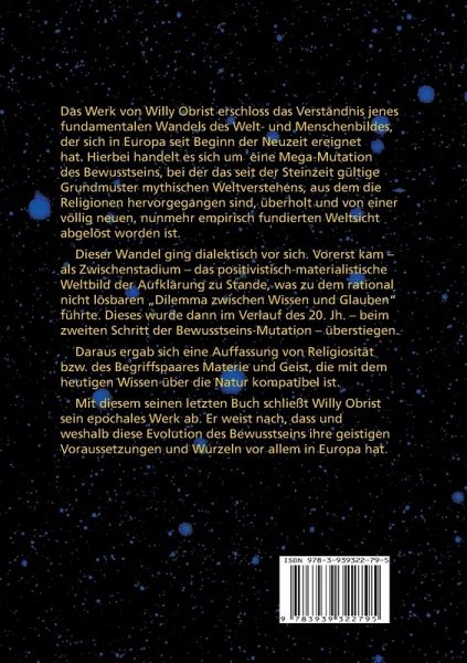 Das Werk von Willy Obrist erschloss das Verständnis jenes fundamentalen Wandels des Welt- und Menschenbildes, der sich in Europa seit Beginn der Neuzeit ereignet hat. Hierbei handelt es sich um eine Mega-Mutation des Bewusstseins, bei der das seit der Steinzeit gültige Grundmuster mythischen Weltverstehens, aus dem die Religionen hervorgegangen sind, überholt und von einer völlig neuen, nunmehr empirisch fundierten Weltsicht abgelöst worden ist. Dieser Wandel ging dialektisch vor sich. Vorerst kam - als Zwischenstadium - das positivistisch-materialistische Weltbild der Aufklärung zu Stande, was zu dem rational nicht lösbaren "Dilemma zwischen Wissen und Glauben" führte. Dieses wurde dann im Verlauf des 20. Jh. - beim zweiten Schritt der Bewusstseins-Mutation - überstiegen. Daraus ergab sich eine Auffassung von Religiosität bzw. des Begriffspaares Materie und Geist, die mit dem heutigen Wissen über die Natur kompatibel ist. Mit diesem seinen letzten Buch schließt Willy Obrist sein epochales Werk ab. Er weist nach, dass und weshalb diese Evolution des Bewusstseins ihre geistigen Voraussetzungen und Wurzeln vor allem in Europa hat.