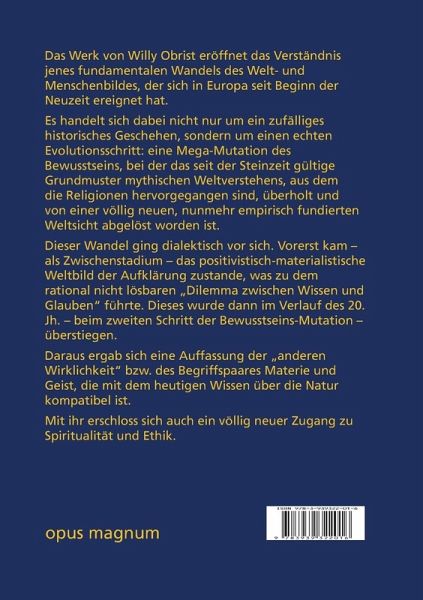 Das Werk von Willy Obrist eröffnet das Verständnis jenes fundamentalen Wandels des Welt- und Menschenbildes, der sich in Europa seit Beginn der Neuzeit ereignet hat. Es handelt sich dabei nicht nur um ein zufälliges historisches Geschehen, sondern um einen echten Evolutionsschritt: eine Mega-Mutation des Bewusstseins, bei der das seit der Steinzeit gültige Grundmuster mythischen Weltverstehens, aus dem die Religionen hervorgegangen sind, überholt und von einer völlig neuen, nunmehr empirisch fundierten Weltsicht abgelöst worden ist. Dieser Wandel ging dialektisch vor sich. Vorerst kam - als Zwischenstadium - das positivistisch-materialistische Weltbild der Aufklärung zustande, was zu dem rational nicht lösbaren "Dilemma zwischen Wissen und Glauben" führte. Dieses wurde dann im Verlauf des 20. Jh. - beim zweiten Schritt der Bewusstseins-Mutation - überstiegen. Daraus ergab sich eine Auffassung der "anderen Wirklichkeit" bzw. des Begriffspaares Materie und Geist, die mit dem heutigen Wissen über die Natur kompatibel ist. Mit ihr erschloss sich auch ein völlig neuer Zugang zu Spiritualität und Ethik.