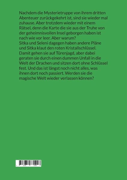 Nachdem die Mysterietruppe von ihrem dritten Abenteuer zurückgekehrt ist, sind sie wieder mal zuhause. Aber trotzdem wieder mit einem Rätsel, denn die Karte die sie aus der Truhe von der geheimnisvollen Insel geborgen haben ist nach wie vor leer. Aber warum?Sitka und Seleni dagegen haben andere Pläne und Sitka klaut den roten Kristallschlüssel. Damit gehen sie auf Türenjagd, aber dabei geraten sie durch einen dummen Unfall in die Welt der Drachen und sitzen dort ohne Schlüssel fest. Und das ist längst noch nicht alles, was ihnen dort noch passiert. Werden sie die magische Welt wieder verlassen können?