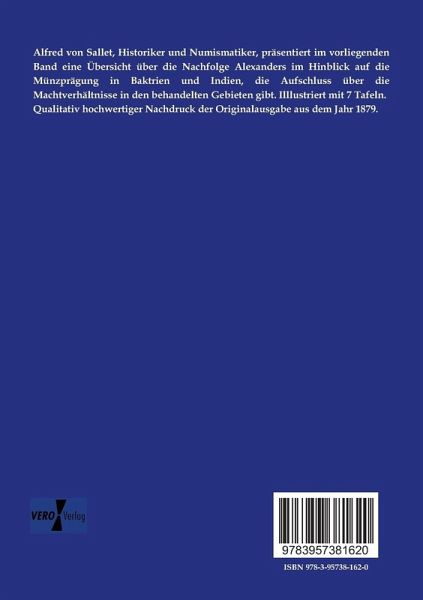 Alfred von Sallet, Historiker und Numismatiker, präsentiert im vorliegenden Band eine Übersicht über die Nachfolge Alexanders im Hinblick auf die Münzprägung in Baktrien und Indien, die Aufschluss über die Machtverhältnisse in den behandelten Gebieten gibt. Illlustriert mit 7 Tafeln.