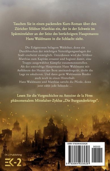 Tauchen Sie in einen historischen Kurz-Roman über den Züricher Söldner Matthias ein, der in der Schweiz im Spätmittelalter an der Seite des berüchtigten Hauptmanns Hans Waldmann in die Schlacht zieht.KLAPPENTEXT: Die Eidgenossen belagern Waldshut, denn ein Durchbrechen der mächtigen Verteidigungsanlagen der Stadt erscheint unmöglich. Unterdessen wird der Söldner Matthias zum Kapitän ernannt und beginnt damit, eine Truppe ausgewählter Kämpfer zusammenzustellen.Als der umtriebige Hauptmann Hans Waldmann die Anführer des Heeres aus Bern unter Druck setzt, droht die Lage zu eskalieren. Und dann gerät Waldmanns Bruder auch noch in einen Hinterhalt.Hans Waldmann und Matthias satteln die Pferde, denn jetzt zählt jede Sekunde ...Lesen Sie die Vorgeschichte zum phänomenalem Mittelalter-Zyklus "Die Burgunderkriege" über den Kampf der Schweizer Eidgenossen für Freiheit und Unabhängigkeit im 15. Jahrhundert.Besagter Zyklus besteht aus zwei Bänden und ist damit abgeschlossen:- Die Nacht am Feuer Band 1 - Die Schlachten am Wasser- Die Nacht am Feuer Band 2 - Der Krieg im WinterDer Kurz-Roman "Die Nacht am Feuer - Der Kampf im Schwarzen Wald" liefert die packende Vorgeschichte zum Protagonisten Matthias von Altstetin. Erfahren Sie, welches Ereignis ihn und Hans Waldmann derart eng zusammengeschweißt hat und wie er seinen treuen Kumpanen Sven trifft ...Tauchen Sie jetzt in die mittelalterliche Schweiz ein; wandeln Sie auf den Spuren des Züricher Söldners Matthias, indem Sie sich diesen Kurs-Roman sichern.