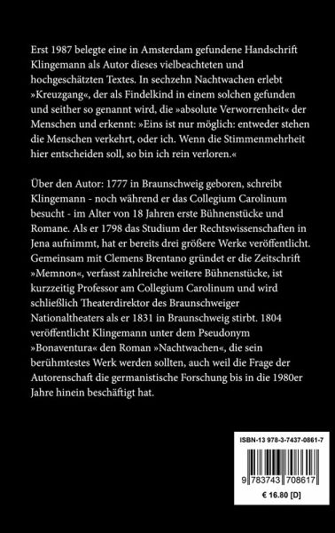 1777 in Braunschweig geboren, schreibt Klingemann - noch während er das Collegium Carolinum besucht - im Alter von 18 Jahren erste Bühnenstücke und Romane. Als er 1798 das Studium der Rechtswissenschaften in Jena aufnimmt, hat er bereits drei größere Werke veröffentlicht. Gemeinsam mit Clemens Brentano gründet er die Zeitschrift "Memnon", verfasst zahlreiche weitere Bühnenstücke, ist kurzzeitig Professor am Collegium Carolinum und wird schließlich Theaterdirektor des Braunschweiger Nationaltheaters als er 1831 in Braunschweig stirbt. 1804 veröffentlicht Klingemann unter dem Pseudonym "Bonaventura" den Roman "Nachtwachen", die sein berühmtestes Werk werden sollten, auch weil die Frage der Autorenschaft die germanistische Forschung bis in die 1980er Jahre hinein beschäftigt hat.