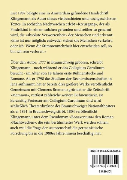 Erst 1987 belegte eine in Amsterdam gefundene Handschrift Klingemann als Autor dieses vielbeachteten und hochgeschätzten Textes. In sechzehn Nachtwachen erlebt "Kreuzgang", der als Findelkind in einem solchen gefunden und seither so genannt wird, die "absolute Verworrenheit" der Menschen und erkennt: "Eins ist nur möglich: entweder stehen die Menschen verkehrt, oder ich. Wenn die Stimmenmehrheit hier entscheiden soll, so bin ich rein verloren."