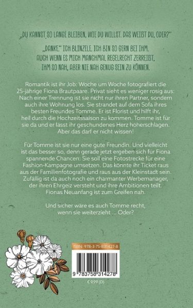 "Du kannst so lange bleiben, wie du willst. Das weißt du, oder?""Danke." Ich blinzele. Ich bin so gern bei ihm. Auch wenn es mich manchmal regelrecht zerreißt, ihm so nah, aber nie nah genug sein zu können.Romantik ist ihr Job: Woche um Woche fotografiert die 25-jährige Fiona Brautpaare. Privat sieht es weniger rosig aus: Nach einer Trennung ist sie nicht nur ihren Partner, sondern auch ihre Wohnung los. Sie strandet auf dem Sofa ihres besten Freundes Tomme. Er ist Florist und hilft ihr, heil durch die Hochzeitssaison zu kommen. Tomme ist für sie da und er lässt ihr geschundenes Herz höherschlagen. Aber das darf er nicht wissen!Für Tomme ist sie nur eine gute Freundin. Und vielleicht ist das besser so, denn gerade jetzt ergeben sich für Fiona spannende Chancen: Sie soll eine Fotostrecke für eine Fashion-Kampagne umsetzen. Das könnte ihr Ticket raus aus der Familienfotografie und raus aus der Kleinstadt sein. Zufällig ist da auch noch ein charmanter Werbemanager, der ihren Ehrgeizversteht und ihre Ambitionen teilt. Fionas Neuanfang ist zum Greifen nah.Und sicher wäre es auch Tomme recht, wenn sie weiterzieht ... Oder?