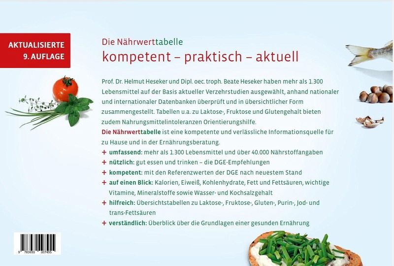 kompetent - praktisch - aktuellProf. Dr. Helmut Heseker und Dipl. oec. troph Beate Heseker haben mehr als 1.300 Lebensmittel auf der Basis aktueller Verzehrstudien ausgewählt, anhand nationaler und internationaler Datenbanken überprüft und in übersichtlicher Form zusammengestellt. Tabellen u.a. zu Laktose-, Fruktose- und Glutengehalt bieten zudem Nahrungsmittelintoleranzen Orientierungshilfe.Die Nährwerttabelle ist eine kompetente und verlässliche Inforationsquelle für zu Hause und in der Ernährungsberatung.- mehr als 1.300 Lebensmittel überprüft und in übersichtlicher Form zusammengestellt- über 40.000 Nährstoffangaben- gut Essen und Trinken - die DGE-Empfehlungen- mit den Referenzwerten der DGE nach neuestem Stand- Kalorien, Eiweiß, Kohlehydrate, Fett und Fettsäuren, wichtige Vitamine, Mineralstroffe sowie Wasser- und Kochsalzgehalt-Übersichtstabellen zu Laktose-, Fruktose-, Gluten-, Purin-, Jod- und trans-Fettsäuren- Überblick über die Grundlagen einer gesunden Ernährung